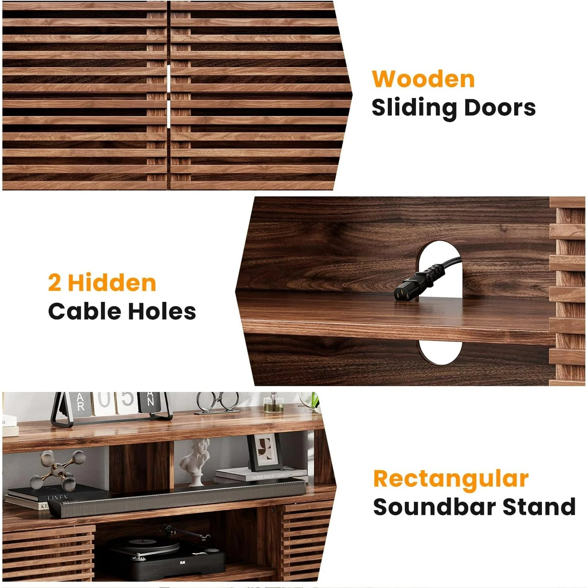 ◦【PREMIUM MATERIALS】- The media console is made of high-quality particle board to ensure strength and durability. The wooden sliding doors are equipped with smooth tracks, making them resistant to wear and providing a smooth opening and closing experience. Additionally, the cabinet is scratch-resistant, wear-resistant, and waterproof, which not only extends its lifespan but also makes daily cleaning easier, keeping your home tidy at all times.