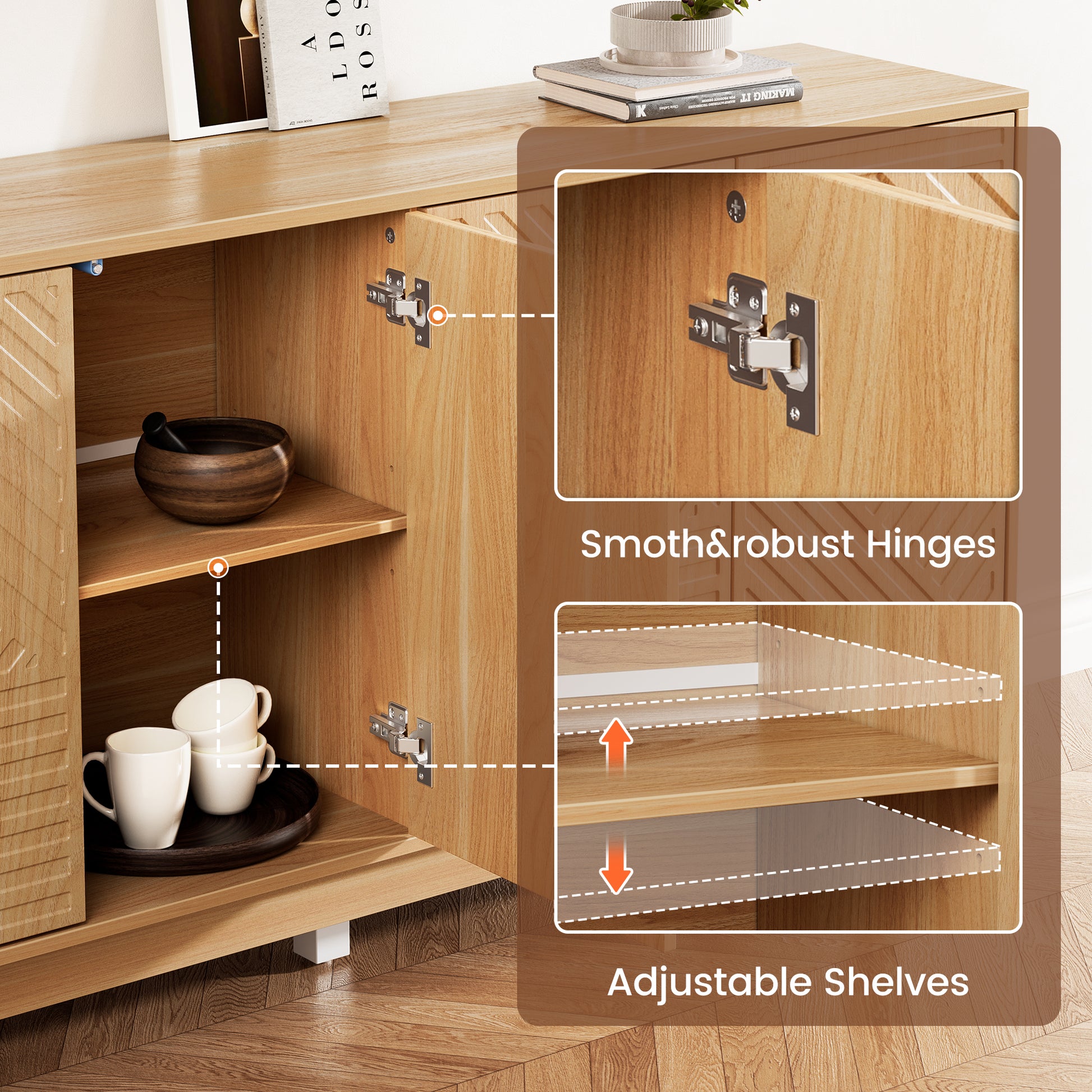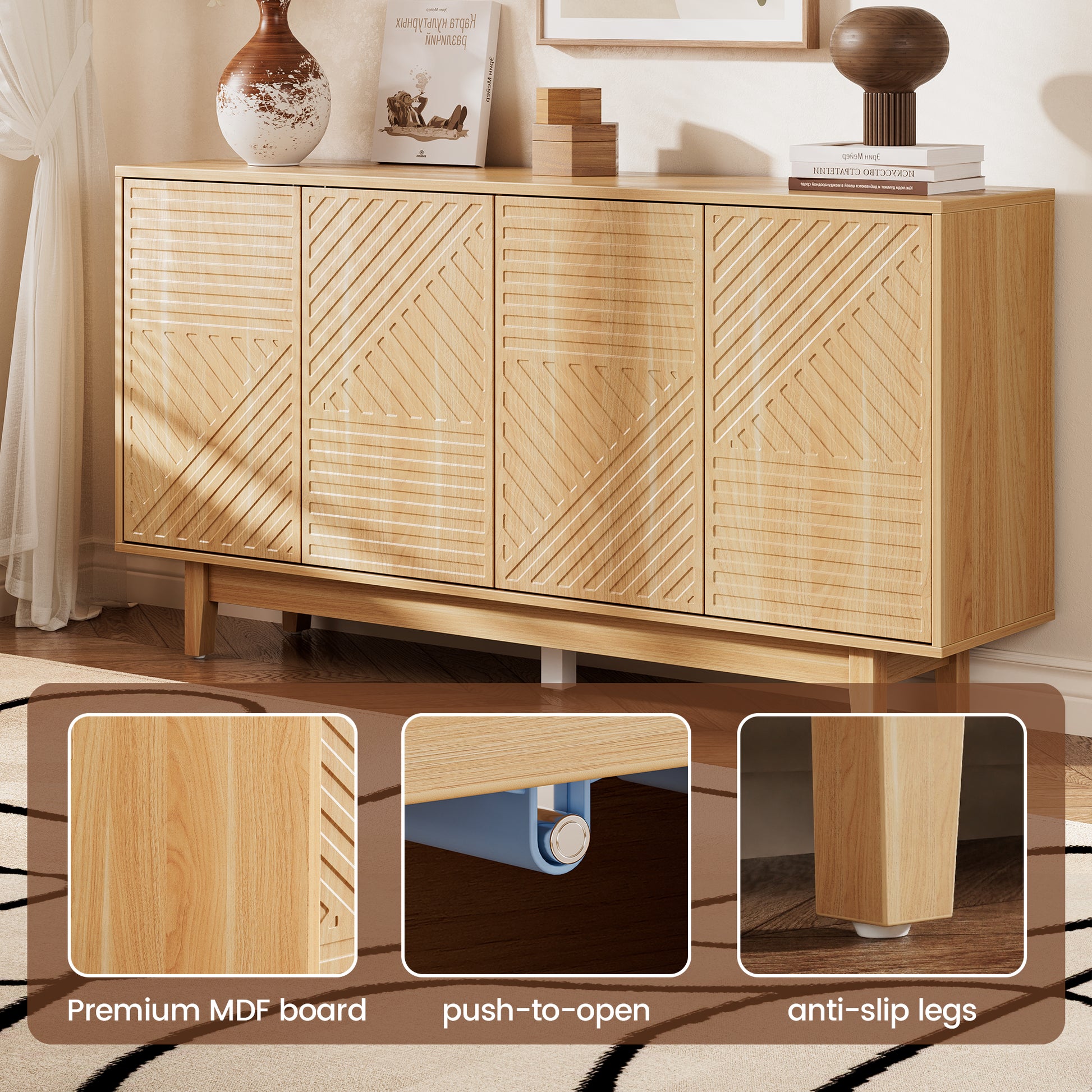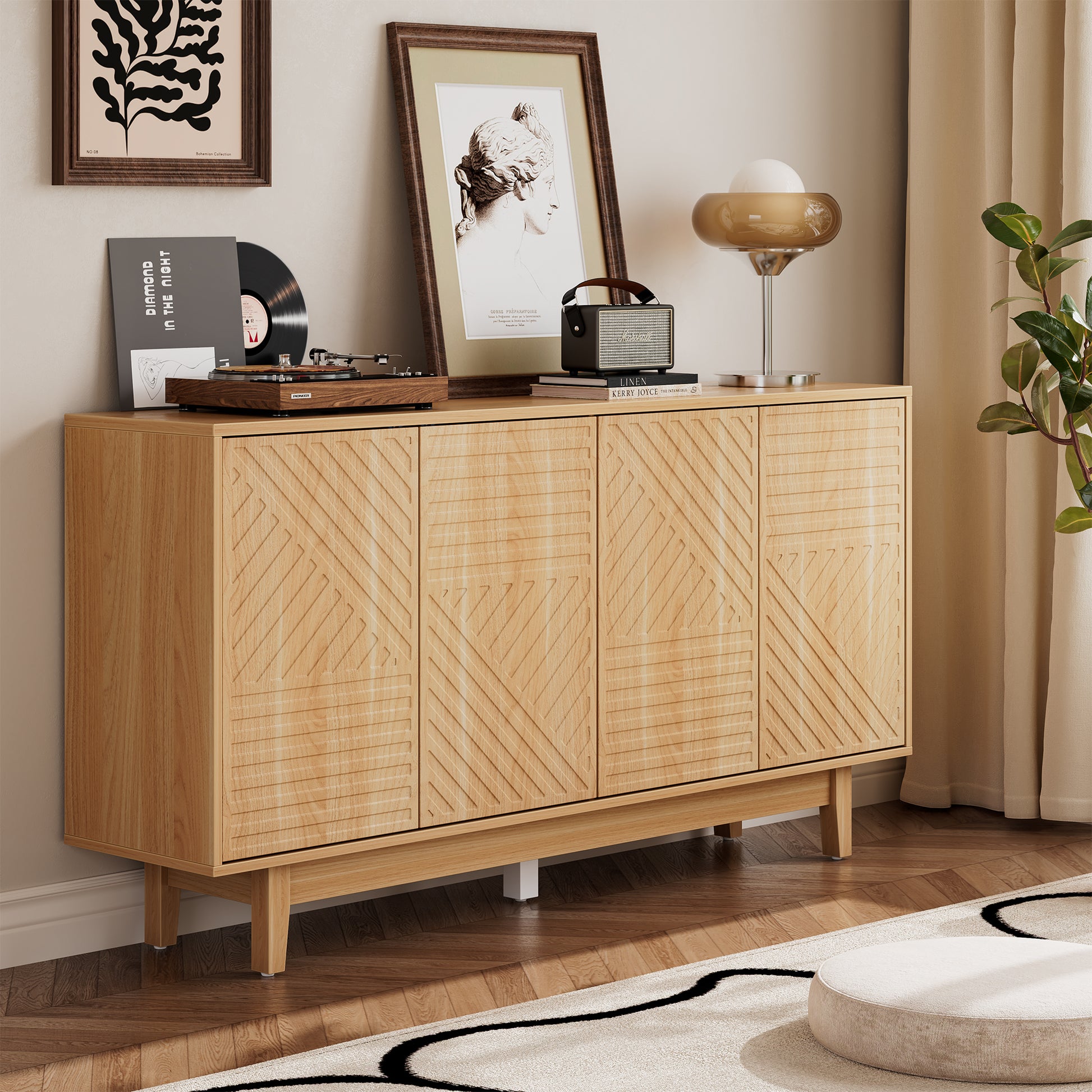 Flycity is committed to providing quality product and satisfactory service. Featuring a striking relief panel with meticulously arranged diagonal slats forming dynamic geometric patterns, the 60 " geometric sideboard cabinet is the perfect blend of style and function. Crafted from high-quality engineered wood with a waterproof finish, the cabinet ’s warm undertones and light wood frame add a touch of modern artistry to your home. The four-door cabinet opens to reveal spacious storage—ideal for organizing tableware, books, or everyday essentials. Whether placed in your living room, dining space, or entryway, this versatile sideboard offers both organization and modern elegance.