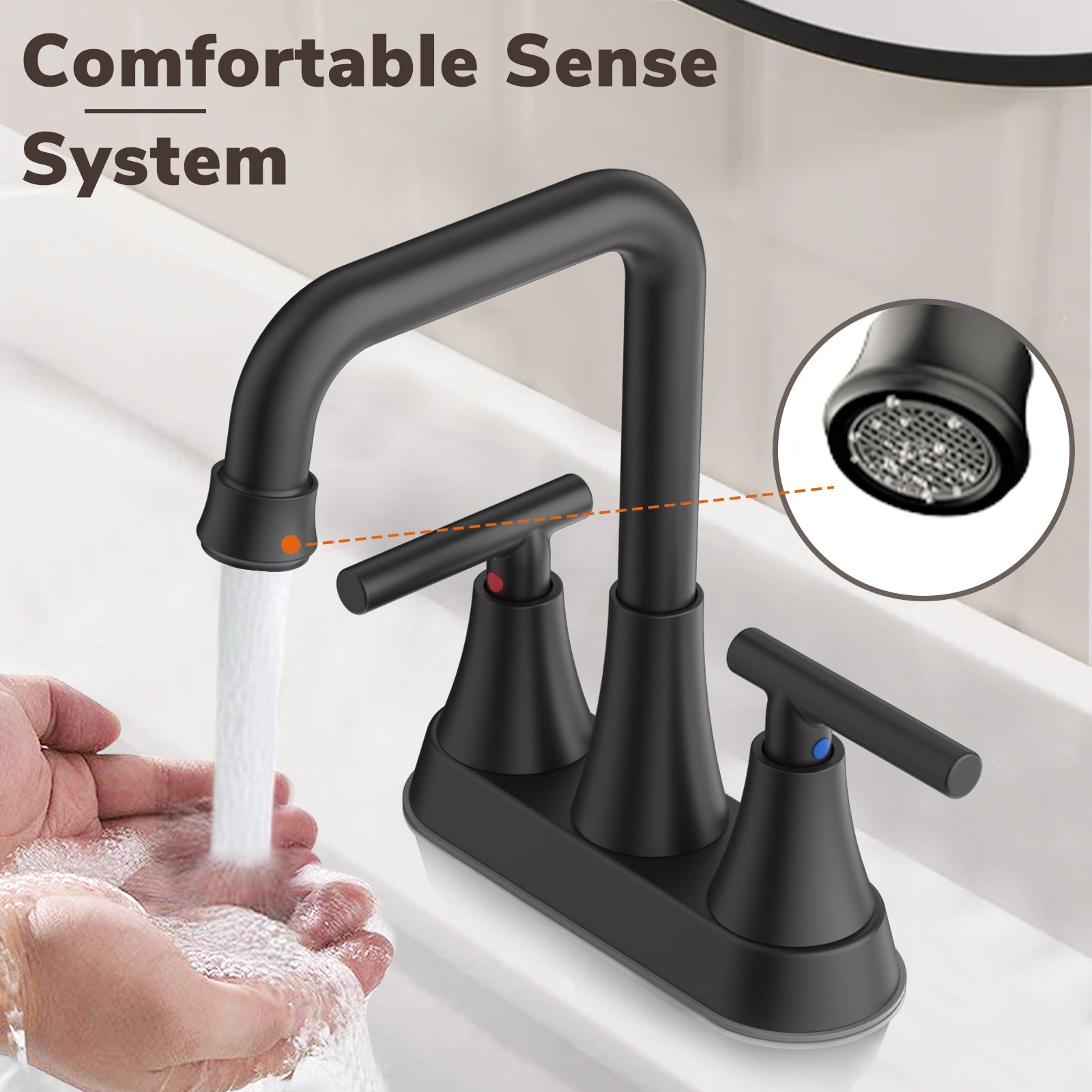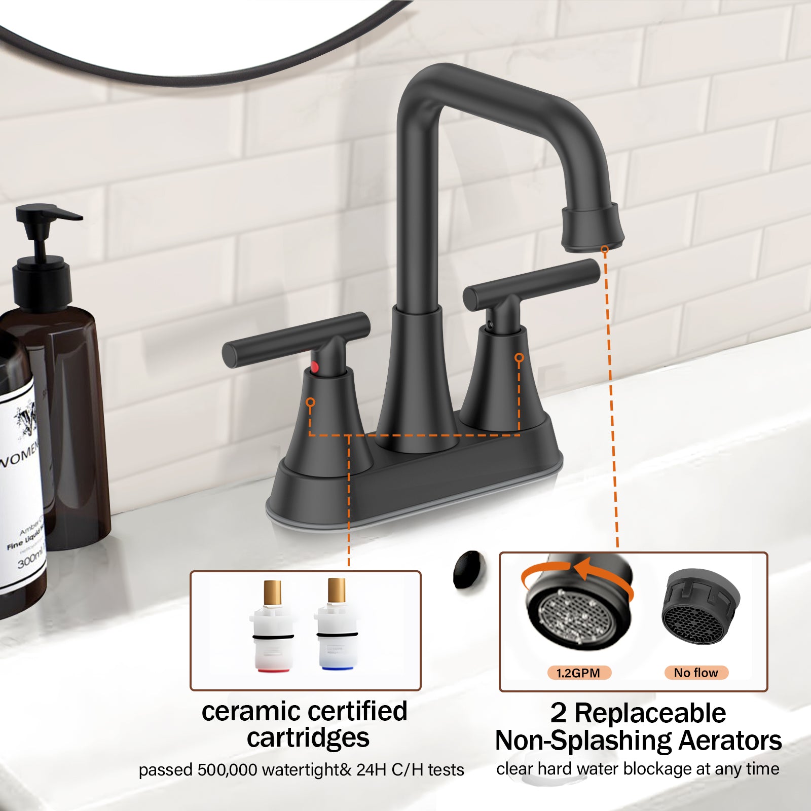 【Smooth Operation】 The bathroom faucet's 2 hot/cold 90-degree lever handles feature drip-resistant ceramic valve cores, allowing for easy individual control of flow and temperature. The 360-degree swivel high spout height bathroom faucet offers plenty of bathroom sink space, enhancing accessibility to the sink.