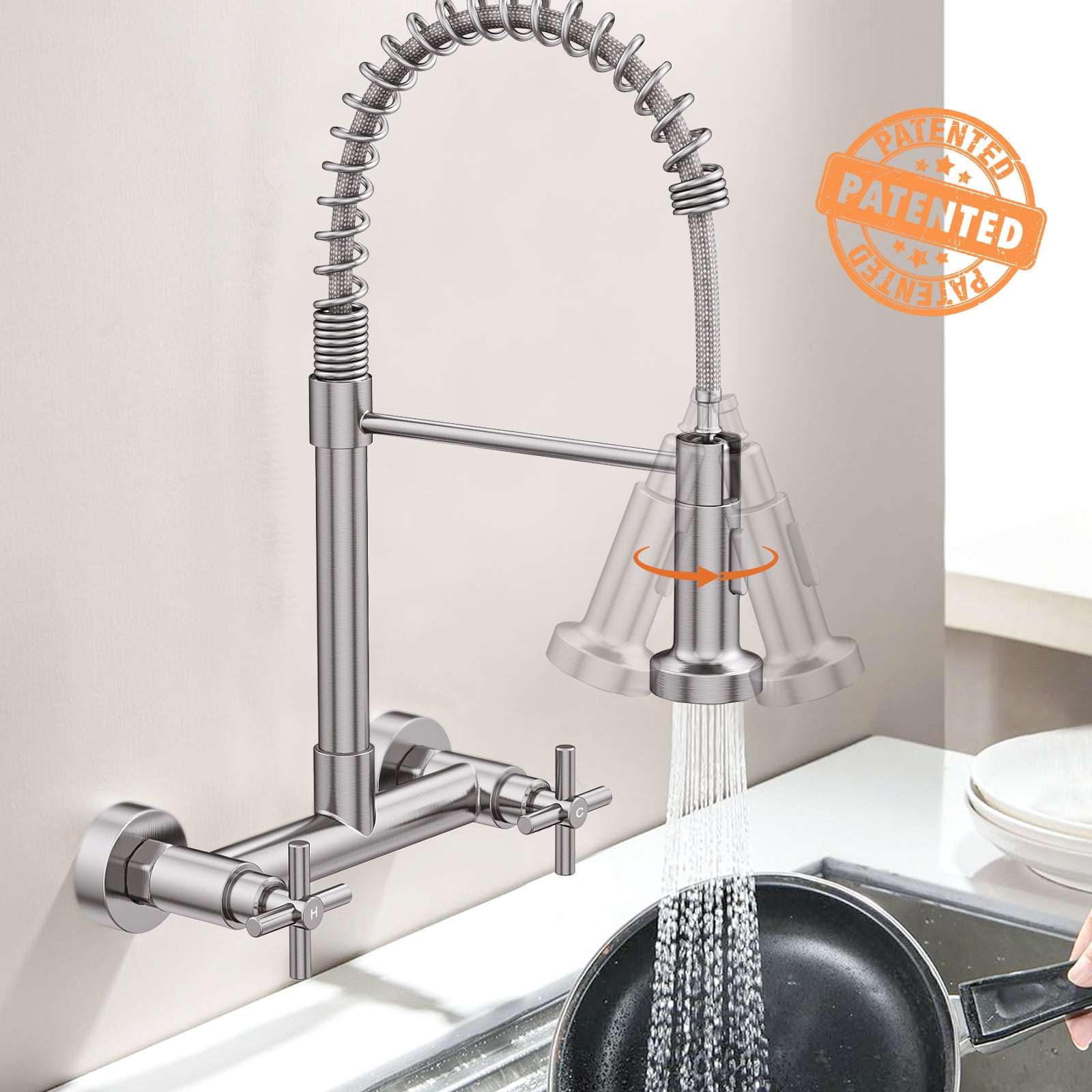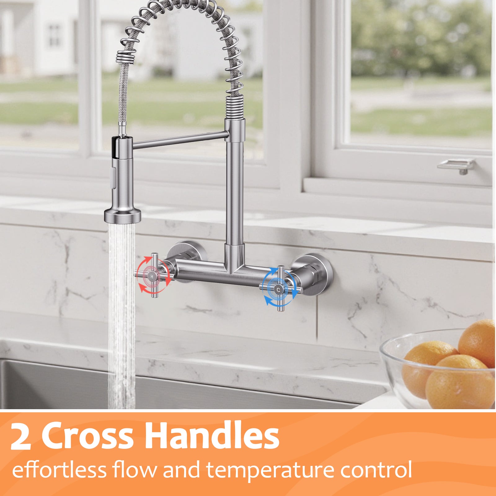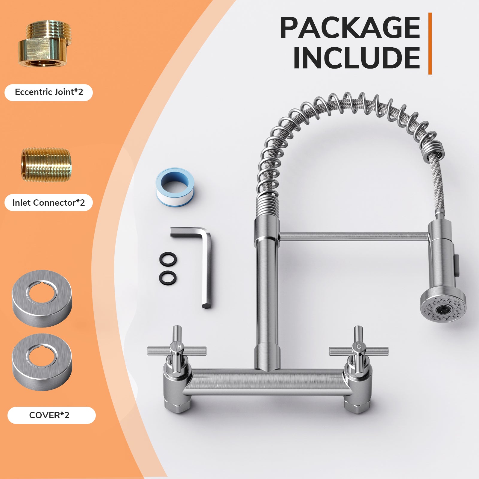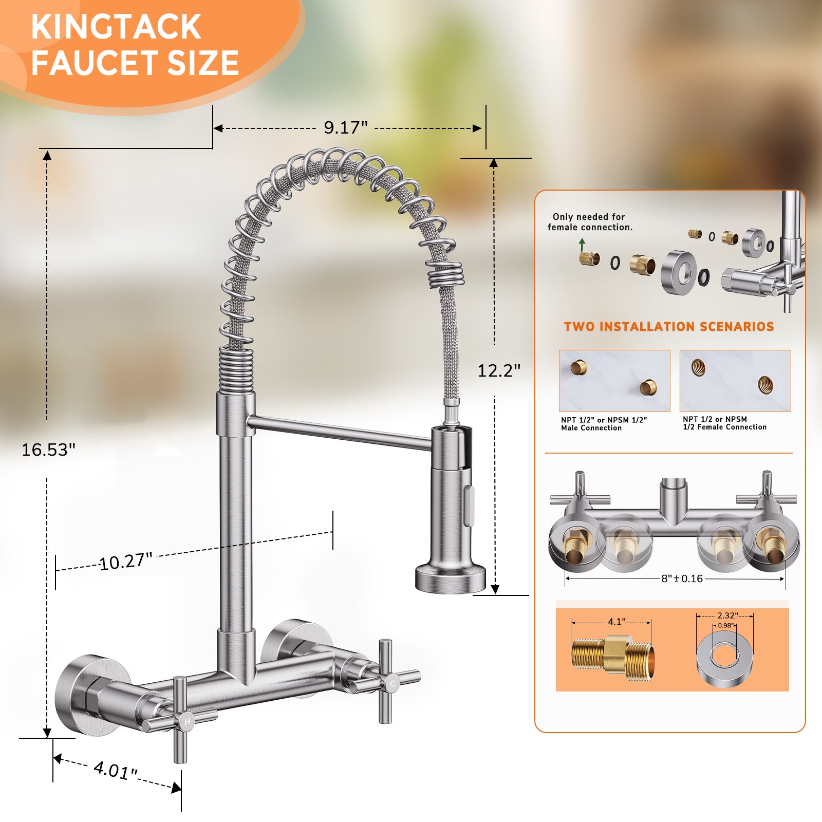 KINGTACK Wall Mount Kitchen Faucet,8 inch Commercial Sink Faucet with Sprayer, Dual Handles Utility Sink Faucet for Kitchen Laundry Restaurant,Stainless Steel